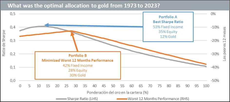 En cuanto a la cantidad de oro en cartera, Wisdom Tree se guía por la mejora en el ratio de Sharpe (la rentabilidad de la cartera en relación con su riesgo). "Empezamos con una cartera ilustrativa del 60% de renta fija y el 40% de renta variable, sin inversión de oro (en 0 en el eje x). El ratio de Sharpe es de 0,37 (línea gris y eje izquierdo). A medida que aumentamos la inversión en oro (moviéndonos a lo largo del eje x) y mantenemos el resto de las ponderaciones de la cartera de ejemplo en una inversión de renta fija y variable del 60/40, el ratio de Sharpe empieza a aumentar. Alcanza su máximo con una inversión en oro del 12%, con un ratio de Sharpe de 0,41, y luego desciende con inversiones en oro más elevadas", explica el experto -ver gráfico-.