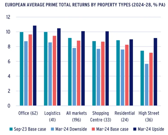 Dentro de los mercados más atractivos, se incluyen el sector residencial prime británico y el logístico prime en España y Bélgica, con una rentabilidad esperada del 8,7% anual. Aunque el ganador en rendimiento esperado es el de las oficinas prime, que la firma sitúa en el 9,6% anual en este informe titulado 'Back to the office' (de vuelta a la oficina). Del otro lado, AEW reduce ligeramente su previsión para el segmento de alquileres prime, del 2,2% al 2,1% anual para 2024-2028.
