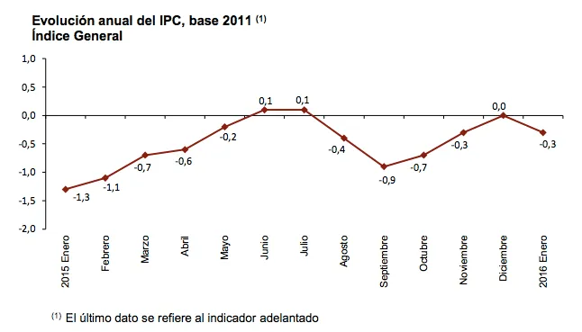 La semana pasada el INE publicó el indicador adelantado del IPC, que proporciona un avance del Índice de Precios de Consumo. Según este, los precios de la electricidad y otros factores han producido una inflación anual en enero de 2016 del –0,3%, tres décimas inferior a la registrada en diciembre. Esta sería la evolución del IPC 2015 sumando el adelantado de ener de 2016: