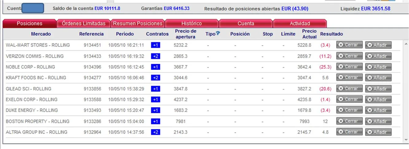 He estado las dos últimas semanas, entre otras muchas cosas, dedicado a estudiar y aprender más de los CFD, analizando varias plataformas y haciendo pruebas virtuales con ellas. Finalmente al principio de la semana pasada abrí una cuenta con 10.000 eur y el martes o mércoles empecé a operar, con tan mala fortuna que perdí una barbaridad, quedando mi cuenta reducida a +-8400 eur.