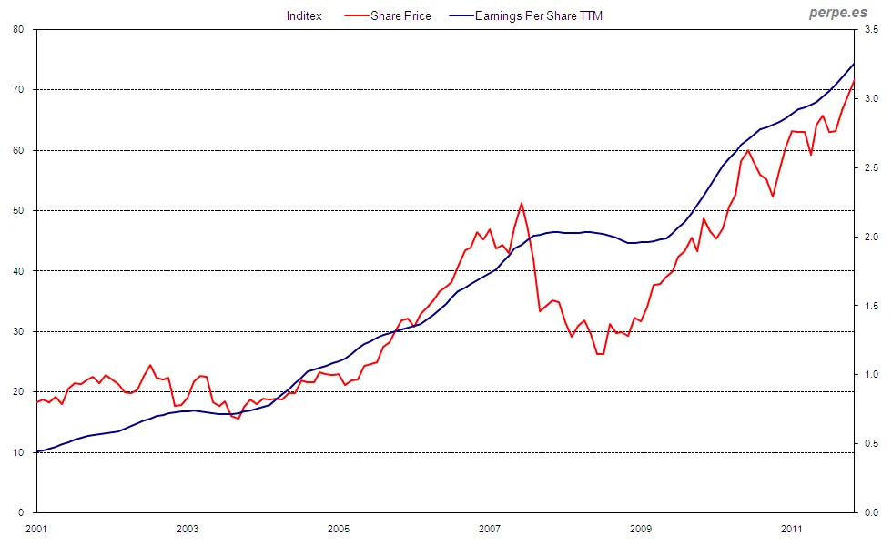 El gráfico de esta semana representa el beneficio por acción de los últimos 12 meses frente a la evolucióm mensual del precio de la acción de Inditex desde el año 2001.