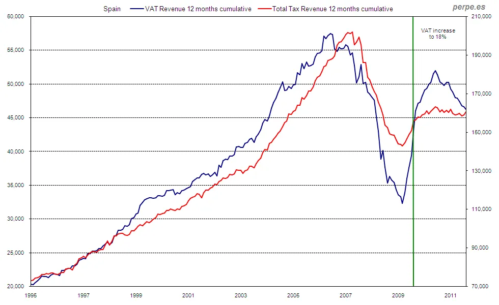 El gráfico de esta semana representa los ingresos tributarios del Impuesto sobre el Valor Añadido (IVA) frente a los ingresos tributarios totales acumulados en 12 meses en España desde el año 1995.