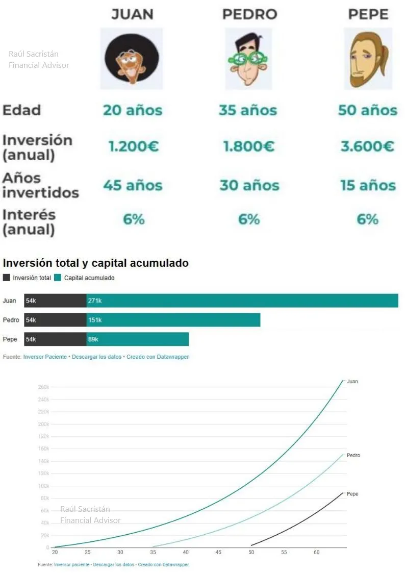 Con la misma inversión total, Juan es el que más capital acumula, casi el doble que Pedro y más del triple que Pepe.