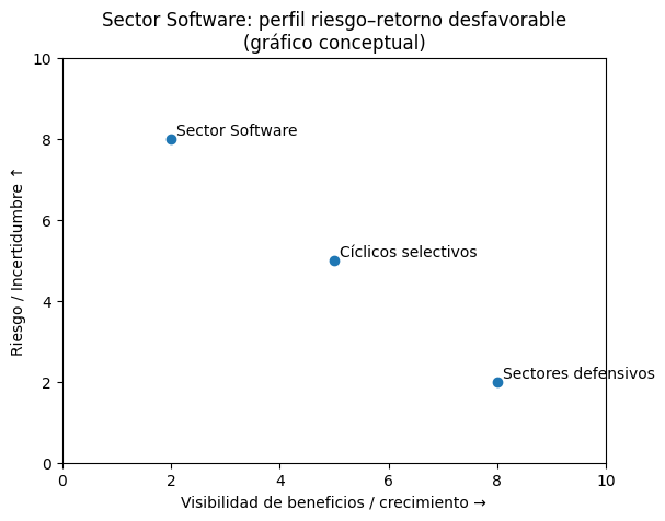 Aunque el software seguirá siendo clave en la economía digital a largo plazo, el momento actual no es óptimo para una sobreexposición al sector. La combinación de crecimiento moderándose, presión competitiva por la IA, sensibilidad macro y valoraciones aún ajustadas sugiere que existen mejores oportunidades de inversión en otros segmentos del mercado con un perfil riesgo–retorno más atractivo.