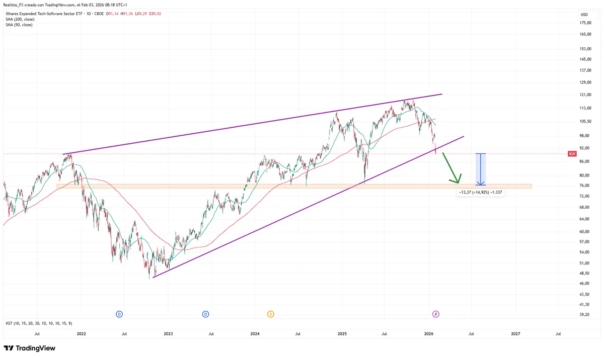 Desde el punto de vista de análisis técnico del sector, el ETF Expanded Tech Software presenta una ruptura bajista de la directriz alcista que favorece una recorrido a la baja del 15%