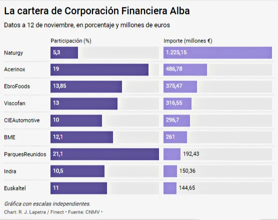 Entre enero y septiembre, Alba ejecutó inversiones por valor de 552 millones de euros y desinvirtió por 102 millones. Su posición de tesorería neta bajó a 445 millones. Los principales movimientos fueron la entrada en Naturgy tras en la venta del 20% que realizó en Repsol y una compra adicional del 0,1% de la gasista por valor de 21 millones. El holding también ha comprado ha reforzado su participación en otras tres de sus empresas tras invertir 77 millones de euros adicionales.