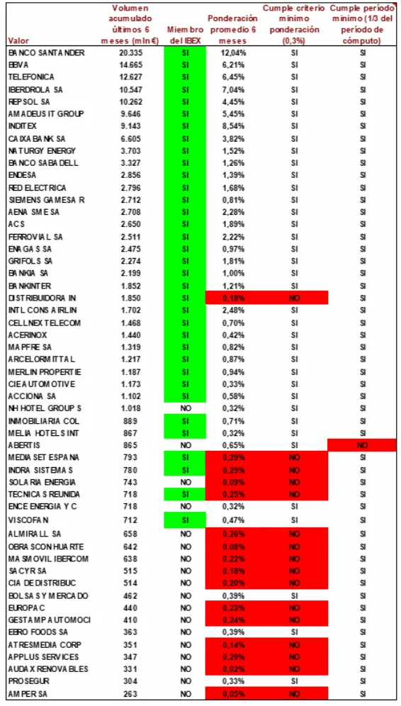 "Aun con todo, y en caso de que el Comité Técnico optase finalmente por excluir a DIA (0,18% capitalización promedio vs 0,3% exigido), el valor mejor posicionado para ocupar su puesto sería Ence, que sí cumple con el criterio mínimo de ponderación. A mucha distancia, un segundo candidato que también cumple con este criterio sería BME. Otros valores con mayor volumen negociado pero que no cumplen con el criterio mínimo y por tanto no podrían ser incluidos: Solaria, Almirall, OHL, Masmovil, Sacyr, Logista o Gestamp”, apuntan desde Renta 4, que ha elaborado un ranking de capitalización y liquidez bursátil para el periodo de cómputo y el cumplimiento de criterios.