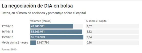 Pero los grandes números aparecen en los volúmenes de intermediación. Según los datos de BME, el volumen negociado en bolsa estos días no tiene parangón en la historia de la empresa. Frente a una media diaria habitual de unos 5 millones de acciones (el 0,8% de la propiedad), DIA ha venido negociando desde el lunes diez veces más acciones (8%) como se puede apreciar en el gráfico.