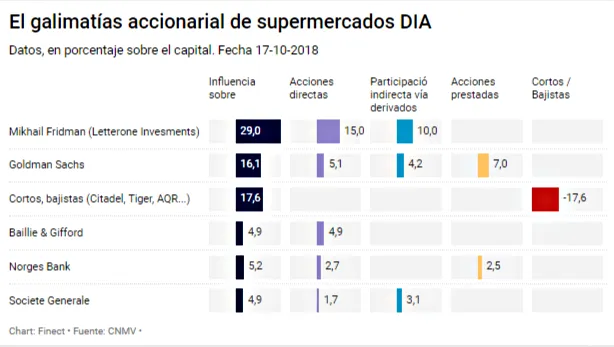 Ese paquete accionarial del banco estadounidense es clave en vísperas de que el ruso Mikhail Fridman ejecute el aumento de participación del 15% al 29% que tiene declarado ante la CNMV. El dueño de DIA llega al trono de la empresa después de poner patas arriba a la empresa, descabezando a toda la dirección de DIA (Currás, Llopis, Sánchez Falcón…), colocando a sus hombres al frente (Ducharme, Holland…) y poniendo en cuarentena los estados financieros de la empresa.