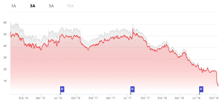 A finales de julio de 2017, tras dos meses en el puesto, Letterone entró por sorpresa en el capital de DIA con la compra del 3% del capital a casi 6 euros por acción y desplegó una sofisticada estrategia de derivados que acaba de terminar 15 meses después con un resultado increíble: Letterone tiene el 29% del capital de DIA y la compañía de supermercados cotiza a 0,7 euros por acción. Ha caído un 88% en bolsa como puedes ver en el gráfico de Finect si clicas en julio de 2017.