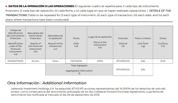 Letterone, a través de su fondo luxemburgués L1 Retail (tiene otros 4 para gestionar sus inversiones en energía, salud, tecnología y tesorería) ha comunicado con fecha de 23 de octubre el resultado del vencimiento de su derivado sobre las acciones de DIA, que se extinguió el pasado viernes 19 de octubre.