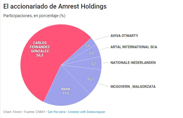 Carlos Fernández González, el miembro del consejo de Banco Santander con más acciones (0,11%) tras la familia Botín, es el cerebro detrás de Finaccess, el holding de inversiones de los antiguos dueños de cervezas Coronita y Modelo, que es quien controla Amrest a través de una sociedad holandesa con el 56% de las acciones. Solo sus participaciones en Santander (0,11%), Colonial (19%) y Prisa 4%) están valoradas en unos 900 millones de euros, que unidas a las acciones de Amrest sitúan el patrimonio bursátil bajo su control en España en unos 1.800 millones. El resto está en manos de directivos, Nationale Nederlanden, Artal, Aviva y el consejero delegado Henry McGovern (10%).