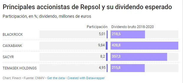 Al dividendo dedicará 4.358 millones entre 2018 y 2020, cuando recuperará el euro por título frente a los 0,9 actuales. Los grandes beneficiados del dividendazo de Repsol serán Caixabank -que cobrará 428 millones brutos en tres años-, la constructora Sacyr (358 millones), los fondos de Blackrock (218 millones) y fondo soberano singapurense Temasek (215 millones).