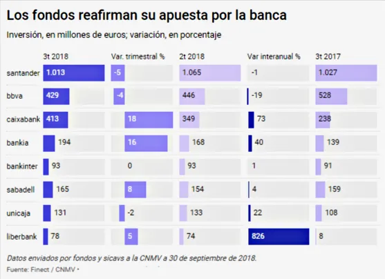 Los principales fondos de inversión y sicavs españolas mantuvieron intacta su apuesta por la banca española en el tercer trimestre de 2018 (julio-septiembre), con un aumento de su inversión del 1% respecto al trimestre anterior y un 9% interanual, según los datos enviados a la CNMV por las firmas registradas en España y que puedes consultar banco a banco en la píldora de Finect. ¿Qué esperan los inversores profesionales de la banca?