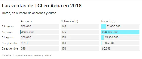En total, TCI ha ingresado 826 millones de euros en lo que va de 2018 y ha reducido en una cuarta parte su participación en la empresa. Aena pierde 5.000 millones de valor en bolsa TCI está presente en el accionariado del gestor aeroportuario a través de Talos Capital, la luxemburguesa TCI Sarl y su famoso The Children Master Fund.