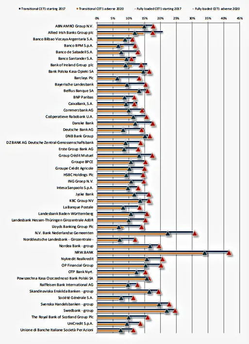 La ratio media de capital de nivel 1 ordinario (CET1) final en el escenario adverso es del 9,9 %, frente al 8,8 % en 2016. El escenario adverso contempla una caída de la ratio de CET1 de 3,8 puntos porcentuales, frente a 3,3 puntos porcentuales en 2016. La EBA ha coordinado las pruebas, definido la metodología y ha recogido los resultados en colaboración con los supervisores nacionales y el BCE. Las entidades han elaborado sus proyecciones de resultados y capital durante un periodo de 3 años (de diciembre de 2017 a diciembre de 2020) bajo dos escenarios macroeconómicos: uno denominado base, y otro adverso. “La solvencia de partida en esta prueba es superior a la de ejercicios anteriores, mostrando la mayor fortaleza del capital de los principales bancos europeos", concluye la autoridad europea.