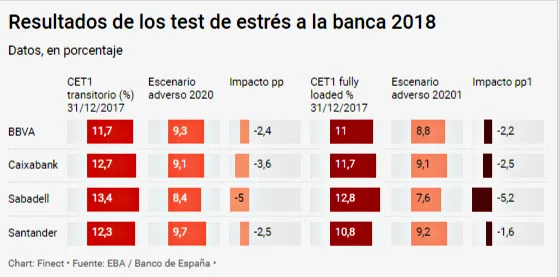 No hay suspensos o aprobados a diferencia de pruebas anteriores. No obstante, el ratio mínimo que se considera como mínimo viable se situaba en el 5,5% de CET1 transitorio y CET1 ‘fully loaded’ que miden la proporción de capital de máxima calidad en relación a los activos del banco y conforme a los nuevos criterios regulatorios. Las entidades españolas lo superan con creces, pero se quedan por debajo de la media europea. Santander es quien sale mejor parado (9,7% CET1 ‘fully loaded’ en el escenario adverso) y Sabadell, quien peor (7,6%), aunque se ha apresurado a recordar que estos resultados no tienen en cuenta la reciente venta de activos inmobiliarios o los ahorros de consumo de capital que le genera la integración del británico TSB. BBVA y Caixabank alcanzan el 8,8% y 9,1%, respectivamente.