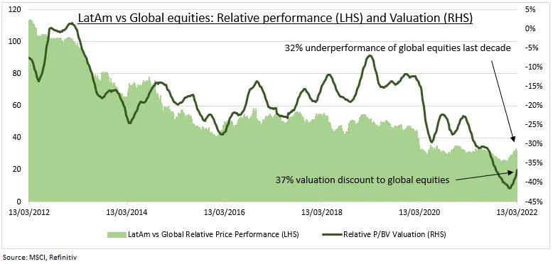 Este gráfico de Refinitiv compara el rendimiento y las valoraciones de los activos globales con los activos de la región de Latinoamérica. Se aprecia cómo el ratio precio-rendimiento de la región supera a la media del índice global desde comienzos de año.