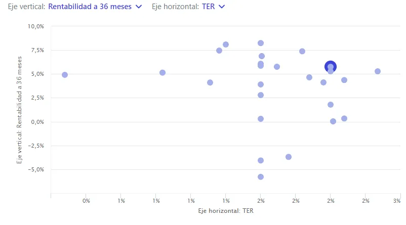La rentabilidad acumulada de los tres últimos años es del 5,7%, mientras que este año rinde un 13,5%. El margen de beneficio del inversor se ve lastrado por una ratio TER del 2%, una de las más altas entre los fondos de su categoría, como se puede comprobar en esta gráfica.