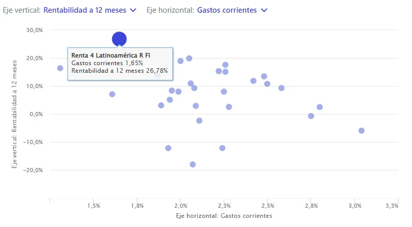 Este fondo de la gestora de Renta 4 diversifica su inversión entre acciones de empresas de muchos países latinoamericanos. Los sectores con más peso son el financiero, que supone una cuarta parte de la cartera (Grupo de Inversiones Suramericana, Grupo Financiero Banorte), materiales básicos y energía (Petrobas, Usinas Siderurgicas de Minas Gerais, Vale SA). La rentabilidad anualizada del último año del fondo supera el 26%, con unos gastos corrientes (1,65%) por debajo de la media de fondos que invierten en América Latina: