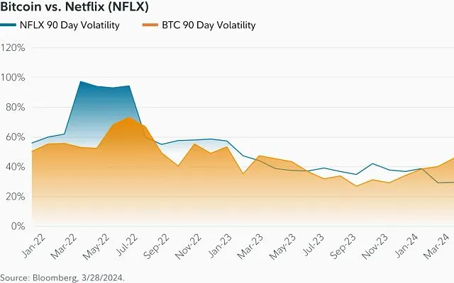 Wainwright pone el caso concreto de la gran tecnológica Netflix: "en los últimos dos años, Bitcoin ha sido menos volátil [...] La volatilidad realizada de NFLX en un periodo de 90 días tuvo un promedio del 53%, mientras que la volatilidad realizada de Bitcoin en el mismo periodo promedió un 46%", comenta.