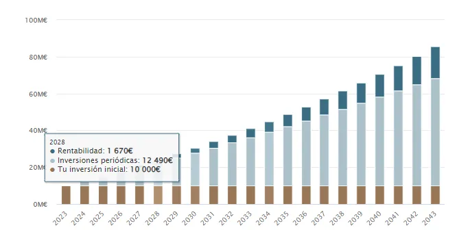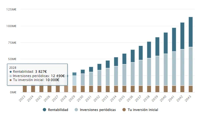 Para 2028, dentro de 5 años, la rentabilidad sería de unos 1.670€ en una cuenta al 2%. Como ves, con las cuentas remuneradas no vas a hacerte rico, pero si puedes "defenderte" un poco del efecto de la inflación (y por supuesto siempre será mejor que una cuenta corriente que no te remunera nada).
