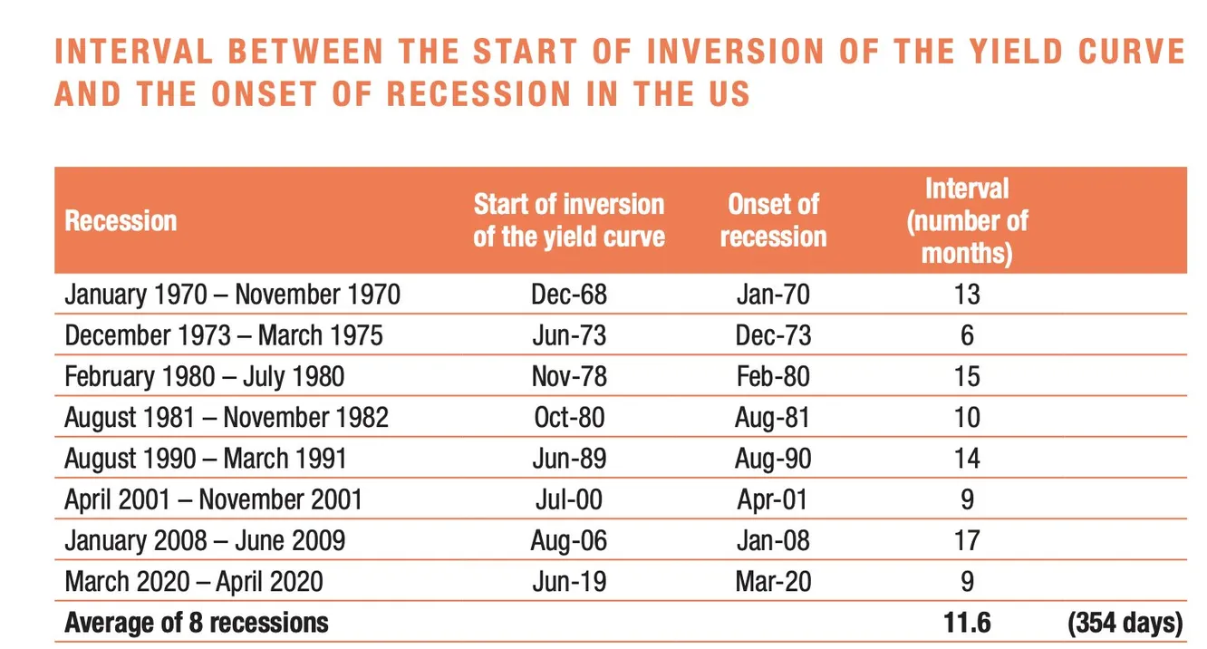 Según datos históricos de ocho recesiones en Estados Unidos recopilados por Banque de Luxembourg Investments, es posible determinar una media de meses entre la inversión de la curva de tipos y la llegada subsiguiente de una recesión: