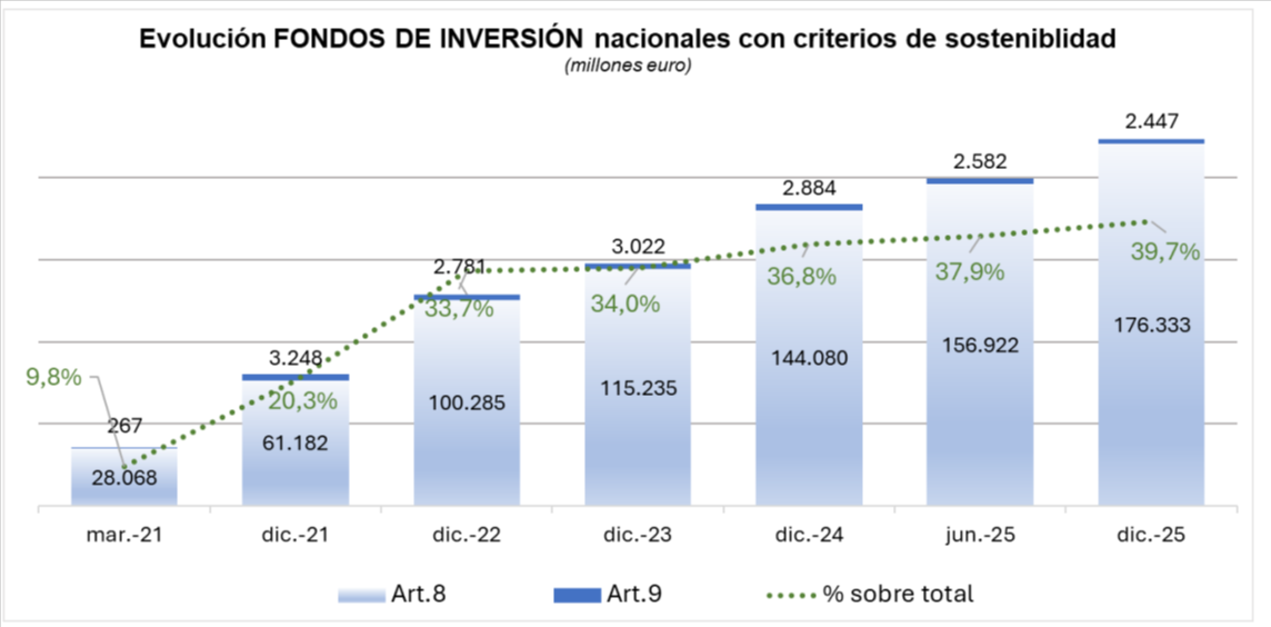 Desde la entrada en vigor del reglamento SFDR en marzo de 2021, el patrimonio de los fondos registrados como artículo 8 o 9 ha crecido en 150.445 millones de euros, pasando de representar el 9,8% del total a casi el 40% al cierre de 2025.