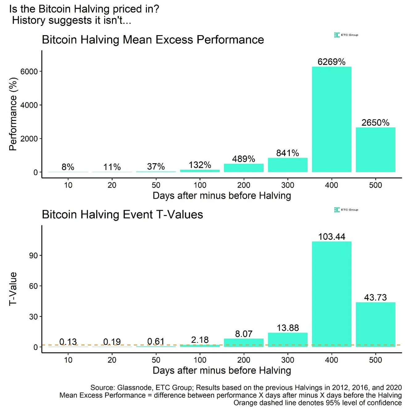 Los resultados de un estudio de ETC Group muestran que, según datos históricos de los 3 anteriores recortes, no hay una diferencia significativa de rendimiento hasta aproximadamente 100 días después del halving, pero después de este periodo, las diferencias se vuelven estadísticamente significativas, especialmente a los 400 días.