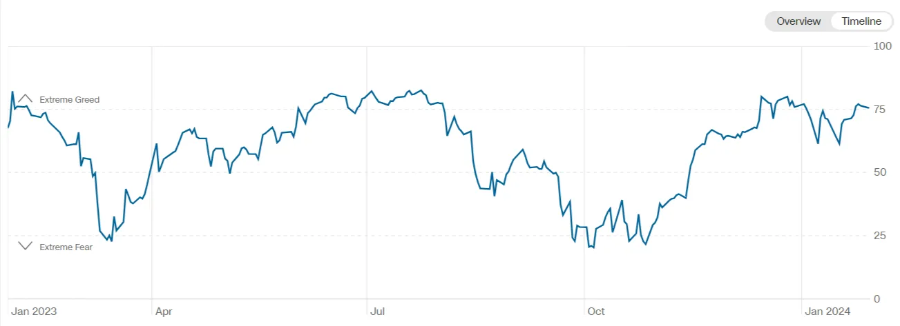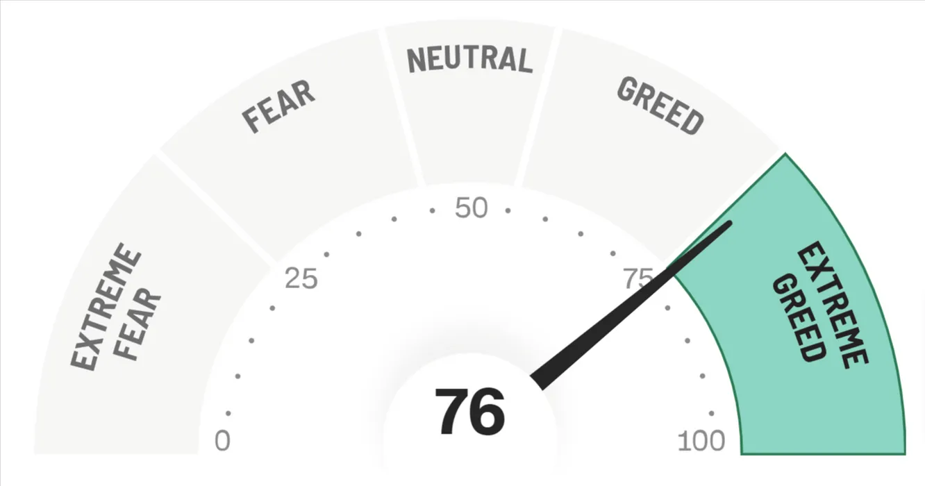 El conocido índice Fear & Greed de CNN ha alcanzado una vez más niveles de "extrema codicia". Este índice, que sirve como termómetro del sentimiento del mercado, se sitúa ahora en 76, sugiriendo que los inversores están mostrando un optimismo considerable hacia las perspectivas del mercado de valores.