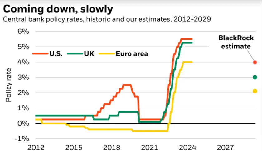 Aunque las rebajas de tipos de interés de los bancos centrales estén cerca, esto no significa que vayamos a entrar en una vorágine de caídas de los tipos, sino que pueden mantenerse altos por más tiempo. "Este no es el típico ciclo de rebajas de tipos", avisan desde BlackRock en un reciente comentario semanal.