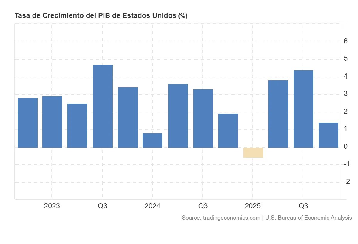 La economía de Estados Unidos registró un crecimiento del 1,4 % anualizado en el cuarto trimestre de 2025, según la estimación preliminar del Producto Interior Bruto (PIB) publicada por la Oficina de Análisis Económico (BEA). Esta cifra representa una desaceleración marcada respecto al 4,4 % del tercer trimestre y se sitúa muy por debajo de las expectativas del consenso de mercado, que apuntaban a un crecimiento cercano al 3%.