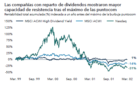 El análisis también pone el foco en episodios de elevada volatilidad del pasado. Durante la burbuja tecnológica, entre marzo de 1999 y marzo de 2002, las compañías con reparto de dividendos mostraron una mayor capacidad de resistencia. En ese periodo, estas empresas registraron una rentabilidad ligeramente positiva, mientras que muchas compañías tecnológicas y el mercado en general experimentaron pérdidas.
