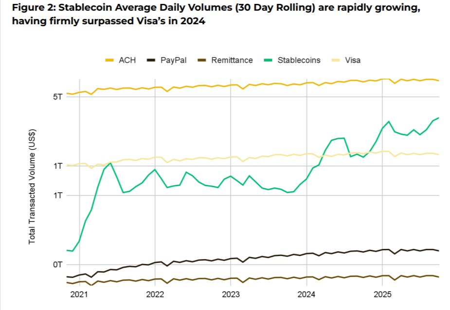 El estudio señala que estas monedas digitales, cuyo valor está vinculado principalmente al dólar estadounidense, ya mueven un volumen medio diario de 3,1 billones de dólares, superando a redes tradicionales como Visa. Solo el sistema Automated Clearing House (ACH) de EE.UU. registra un volumen superior, con aproximadamente 7,3 billones diarios.