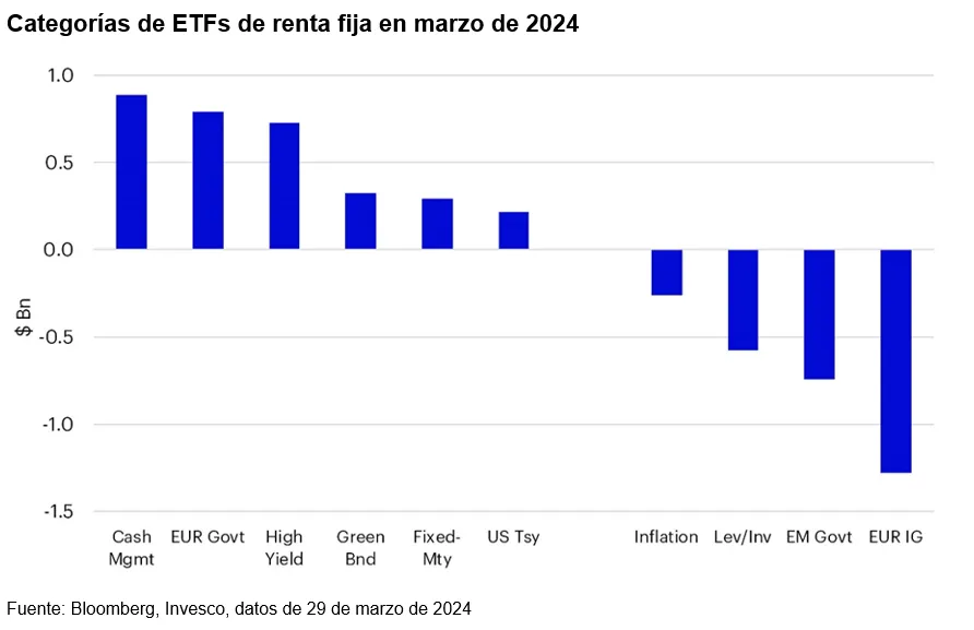 Los ETFs de renta fija han captado 12.100 millones de dólares en nuevos activos netos durante el primer trimestre de 2024, aunque el ritmo de entradas de dinero se redujo a 1.000 millones de dólares en marzo, según Invesco. En marzo eso sí se pudo apreciar una mejora en los mercados de renta fija que hizo que estos ETFs obtuvieran rentabilidades positivas tras unos dos primeros meses de peores resultados.