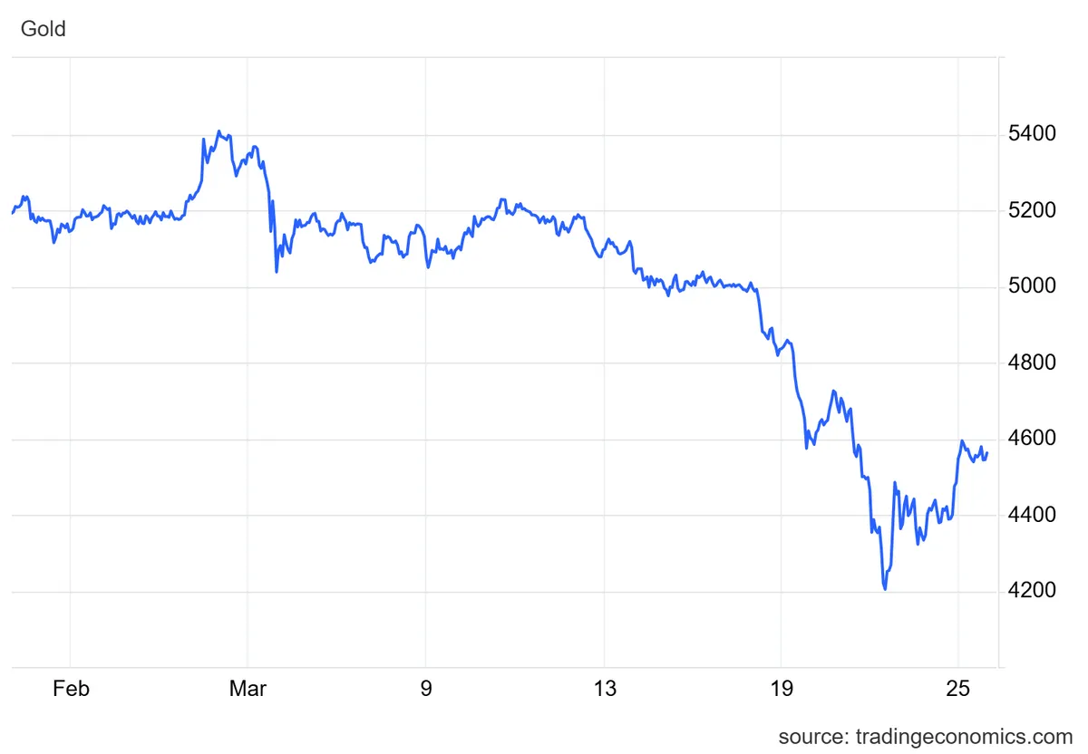 El oro lleva semanas haciendo lo contrario de lo que se supone que tiene que hacer. Desde que el 28 de febrero estallara el conflicto en Oriente Próximo —con el primer ataque coordinado entre Washington y Tel Aviv sobre Teherán— el metal precioso ha llegado a perder más de un 22%. De cotizar en torno a los 5.300 dólares la onza el día anterior al inicio de la guerra... a los 4.100 dólares el pasado lunes 23 de marzo.