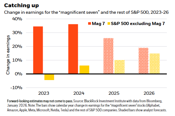En este sentido, la entidad apunta que, aunque “la brecha entre las ‘siete magníficas’ y el resto del S&P 500 se está reduciendo”, estas compañías “siguen entregando un fuerte crecimiento de beneficios” y podrían mantener un papel dominante en el conjunto del índice .