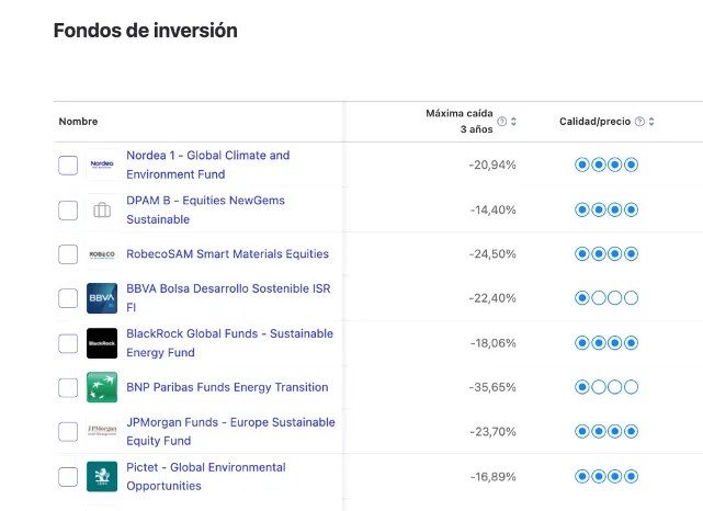 En un momento como el que estamos atravesando actualmente, con grandes caídas en muchos productos, es fundamental tener en cuenta conceptos como este. En Finect, en los diferentes listados de fondos de nuestros escaparates puedes encontrar este ratio, como verás en esta imagen: