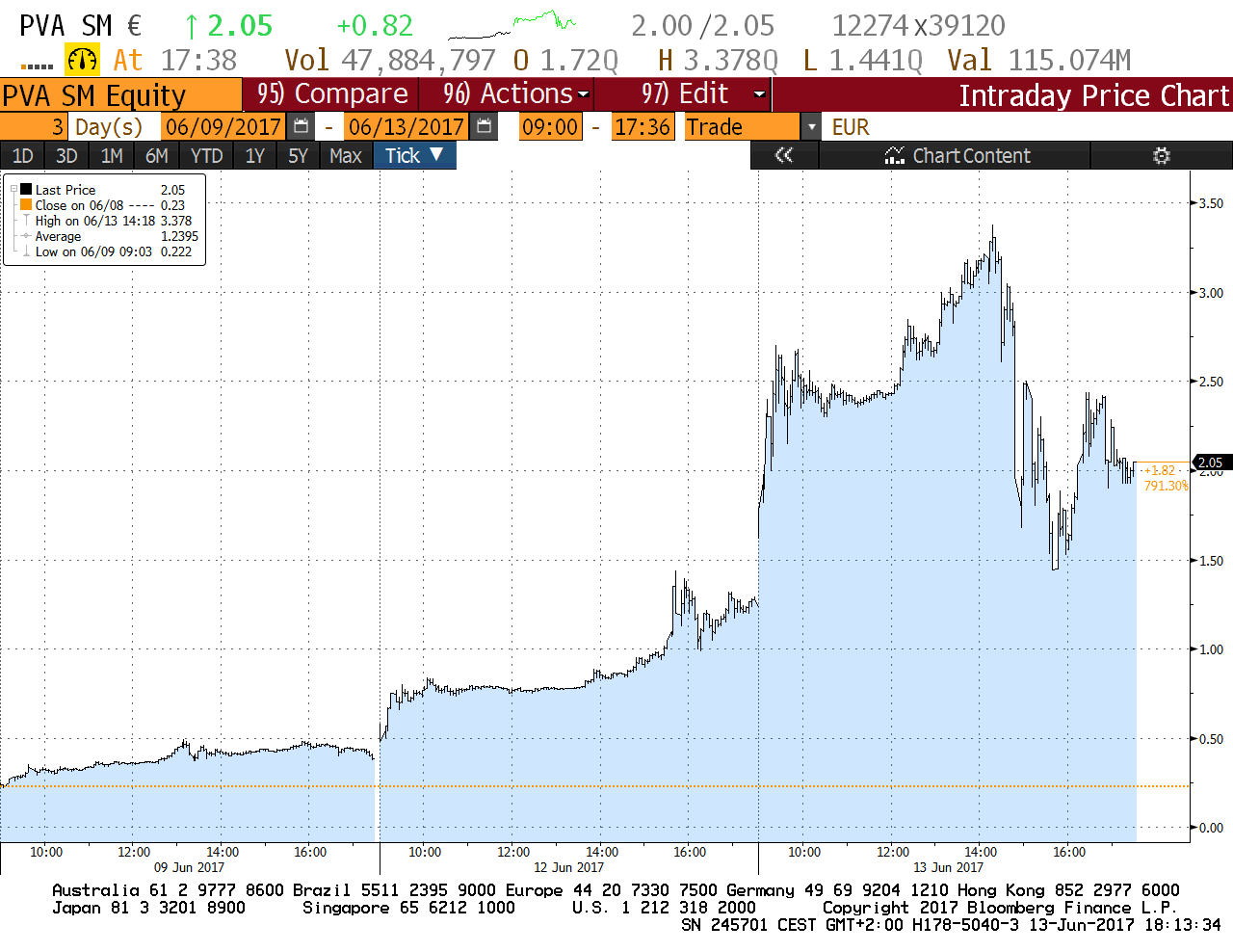 Que pasó de 0,22 a 3,37 en… tres días. Casi nada, multiplicar por 15 tu inversión, de 1.000€ a 15.000€ en tres días. Lo que hace que si alguien invierte en Pescanova y logra esta rentabilidad nos deja al traste la tarea hecha por los gestores.