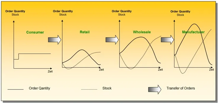 Para una mejor interpretación imagínese una isla que recibe turistas y que tan solo consumen helados. A partir de un momento, el número de turistas se dobla. El vendedor de helados, que tiene helados en su nevera para dos días, atiende al incremento de demanda sin problema. Pero se da cuenta que se le han terminado en un día. Para ello llama rápidamente a su distribuidor y le pide que le traiga más helados para cuatro días (dos de consumo normal y dos para reponer su nevera). El distribuidor se da cuenta que la tienda le ha pedido dos días más de lo normal, con lo que lo atiende mediante los stocks que tiene en el almacén, con lo que le manda lo equivalente a cuatro días. Por su parte, el distribuidor pide a la fábrica de helados lo equivalente a ocho días (cuatro porque piensa que la demanda ha aumentado en ello y su equivalente en inventario). Ante este incremento de demanda (pensar que originalmente el fabricante producía helados para dos días) el fabricante lo para con su nivel de inventarios y empieza a producir como si la demanda hubiera crecido de dos a ocho días. Tan solo al cabo del tiempo, la tienda, el distribuidor y el fabricante se dan cuenta que su nivel de inventario aumenta descontroladamente porque la demanda pasó de lo equivalente a dos días (se dobló) pero el fabricante pasó de producir lo equivalente a un día a ocho, con lo que los siete restantes estarán en los inventarios cuando la situación se normalice. Como el inventario será demasiado (7 días) el productor de helados irá deshaciendo inventario y no fabricará nada, aunque la demanda haya aumentado. En conclusión, deberá pasar un tiempo hasta que toda la cadena productiva se reestablezca.