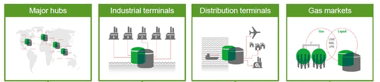 - Centros logísticos (Hub Terminals): almacenaje en grandes centros logísticos en mitad de las grandes rutas navales para su distribución internacional. Actualmente cuenta con cuatro en los principales puertos: región ARA (Ámsterdam – Róterdam- Amberes), Houston, Fujairah (Emiratos Árabes) y Singapur.