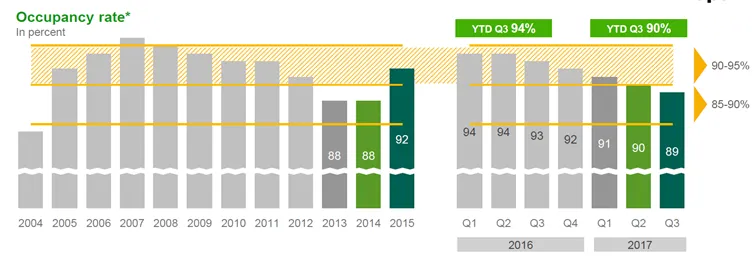 El porcentaje de ocupación es la clave en el negocio y es el motivo de la bajada estos últimos 12 meses. Teniendo en cuenta que un 95% de ocupación se considera plena ocupación debido a que el 5% del tiempo se destina a mantenimiento-limpieza, podríamos decir que Vopak se ha mantenido estable estos últimos 10 años a niveles promedios de 93%.