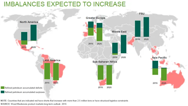 - Desajustes entre áreas productivas y consumidoras. Existen regiones con superávits de refino de crudo (verde oscuro) y regiones con déficit (verde claro). Esto lleva la necesidad de transporte y almacenaje.