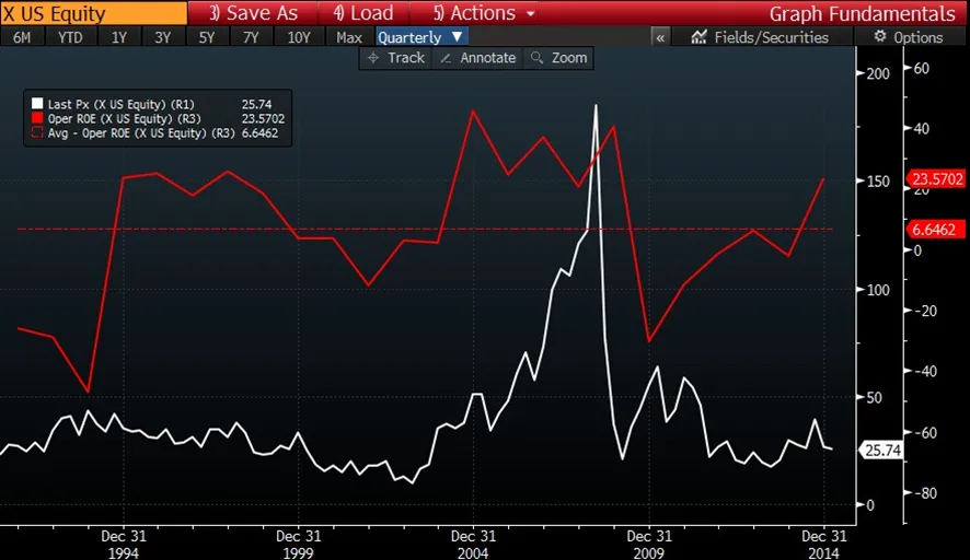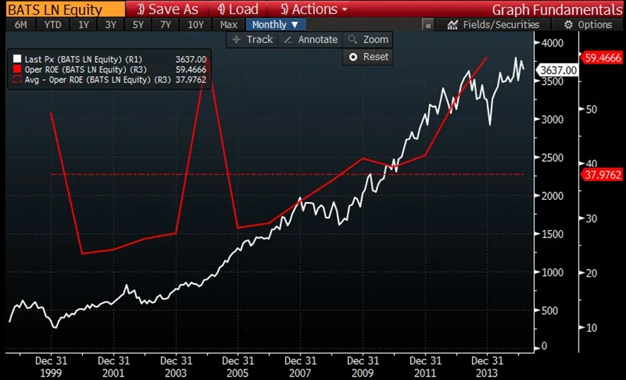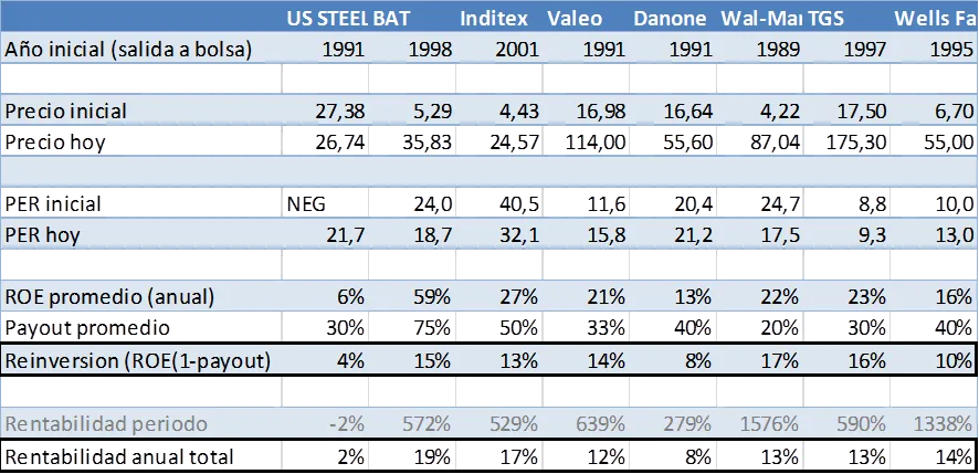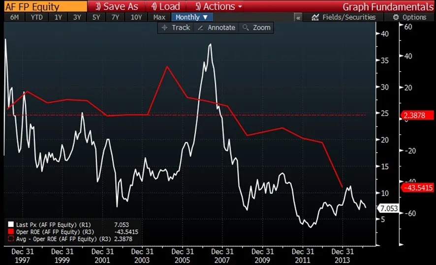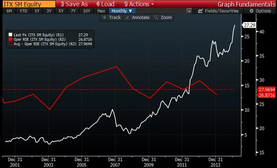 Pero como un gráfico vale más que mil palabras, vayamos a ellos (Rojo: ROE. Blanco: cotización). En ellos podemos ver los conceptos de MOAT de Buffett y Pat Dorsey. Las empresas con claras ventajas competitivas mantienen la rentabilidad (Inditex, British American Tobacco) y las empresas que no, ven disminuir sus rentabilidades (US Steel – Air France)