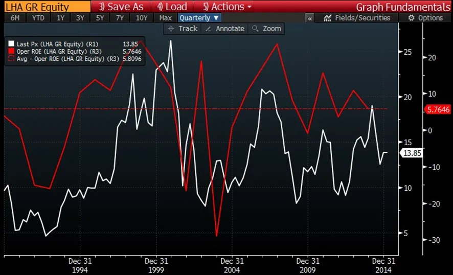 Air France (primero) y Lufthansa (segundo) son claros ejemplos de sector competitivo con sobrecapacidad. ROE altos parecen no mantenerse durante mucho tiempo.