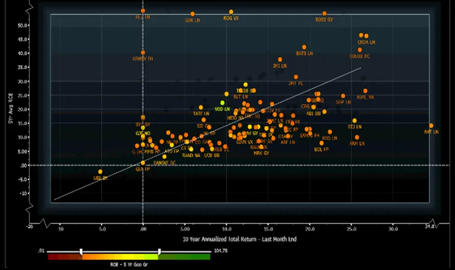 En realidad el concepto del tipo de interés compuesto se resume en este gráfico (en el eje horizontal está la rentabilidad anualizada de los últimos 10 años y en el eje vertical está el ROE promedio de los últimos 5 años).