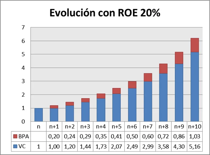 Si la empresa puede reinvertir cada año a una tasa de reinversión igual a ROE(1-payout), cada año que pase el crecimiento será exponencial, al obtener una rentabilidad de la rentabilidad ya lograda.